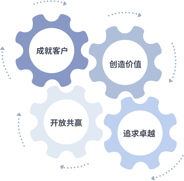 成就客户是一切决策的出发点,,创造价值是衡量所有工作的标准,,,追求卓越是我们做事做人的态度,,,开放共赢是我们的格局也是最终的结果。。。。价值观的齿轮环环相扣,,推动着组织里的每个人不断向前。。